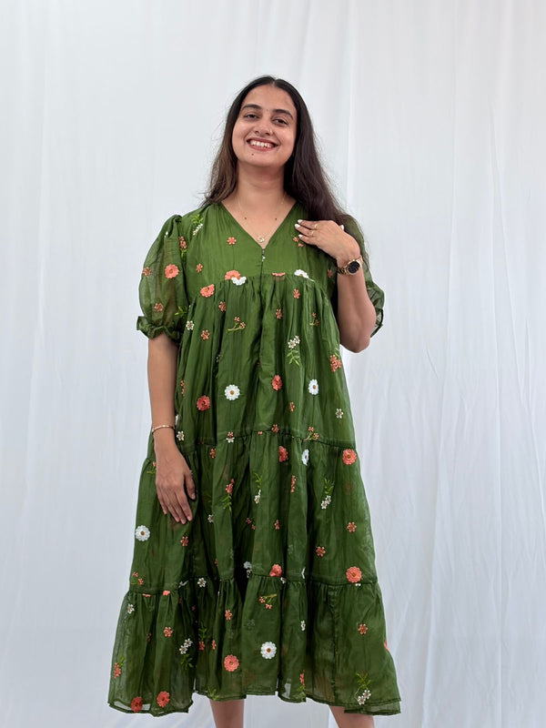 Green Floral Embroidered Mul Chanderi Flared Feeding Gown With Single Centre Invisible Zip | Free Size | 44" length
