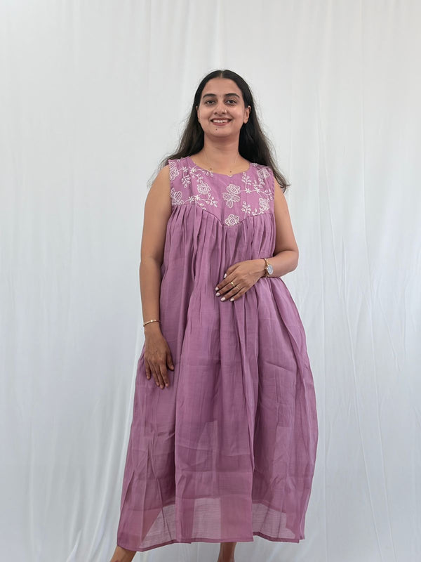 Lavender Floral Embroidered Mul Chanderi Flared Feeding Gown With Single Centre Invisible Zip | Free Size | 44" length