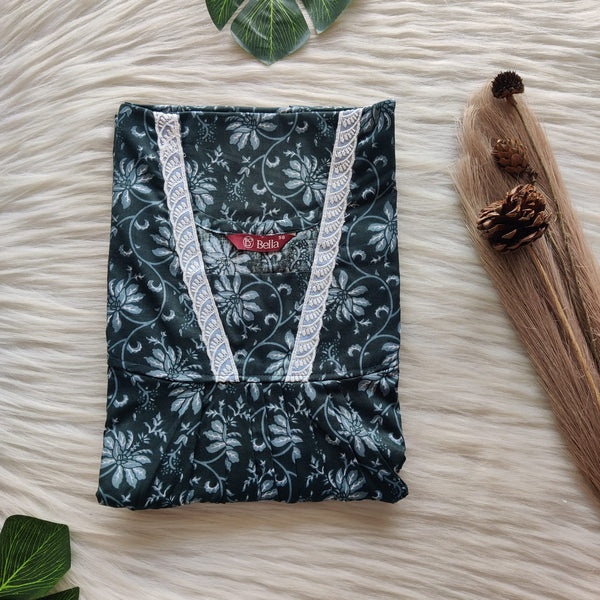 Dark Green And White Printed Premium Cotton Button Zip Nighty | Free Size | Chest Width 44″| Length 55″-56″
