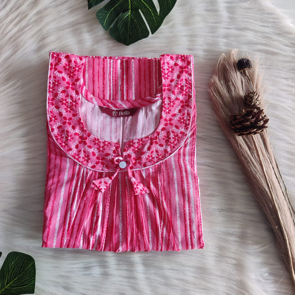 Peach And White Stripes Printed Premium Cotton No Zip Pleated Nighty | Free Size | Chest Width 44″| Length 55″-56″