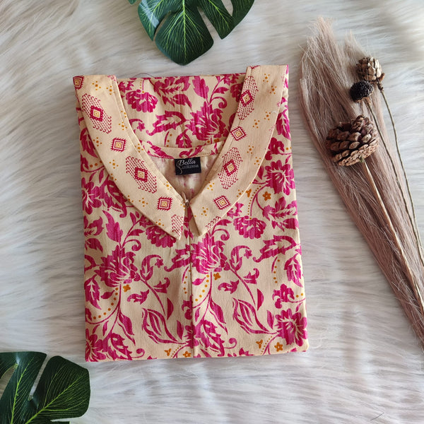 Pink And Sandal Printed Premium Cotton Peter Pan Collar Long Zip Feeding Nighty | Free Size | Chest Width 44″| Length 56″