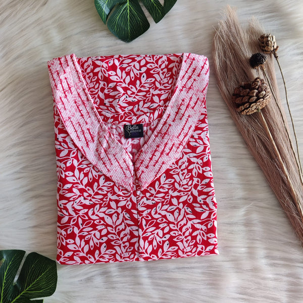Red And White Floral Printed Premium Cotton Peter Pan Collar Long Zip Feeding Nighty | Free Size | Chest Width 44″| Length 56″