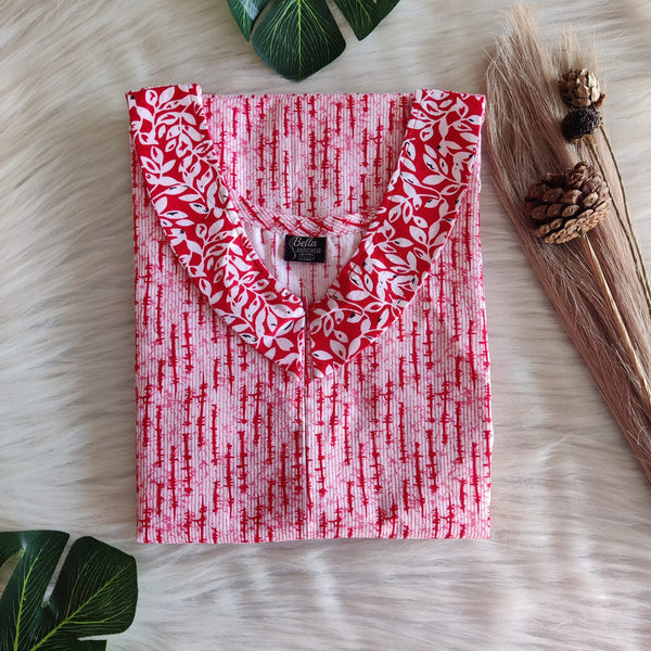 Red And White Printed Premium Cotton Peter Pan Collar Long Zip Feeding Nighty | Free Size | Chest Width 44″| Length 56″