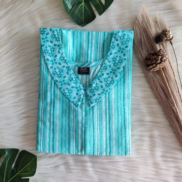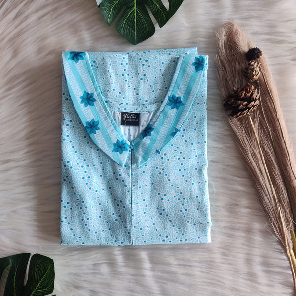 Aqua Blue And White Printed Premium Cotton Peter Pan Collar Long Zip Feeding Nighty | Free Size | Chest Width 44″| Length 56″