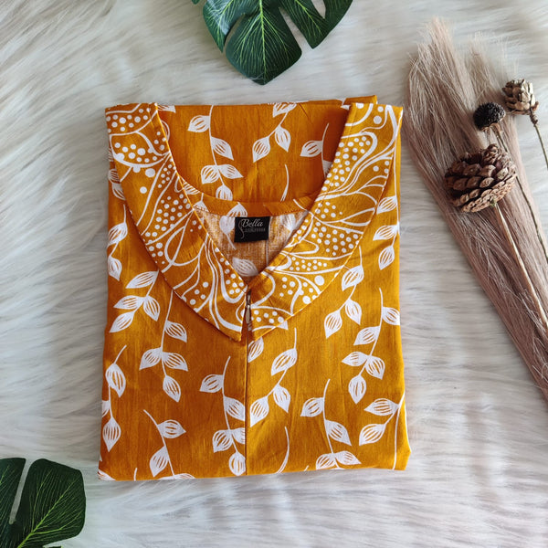 Yellow And Grey Floral Printed Premium Cotton Peter Pan Collar Long Zip Feeding Nighty | Free Size | Chest Width 44″| Length 56″
