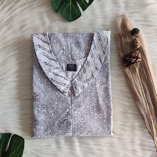 Grey And White Floral Printed Premium Cotton Peter Pan Collar Long Zip Feeding Nighty | Free Size | Chest Width 44″| Length 56″