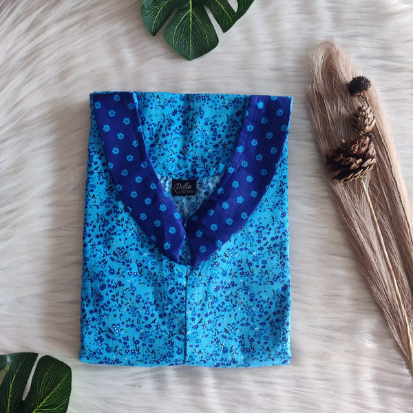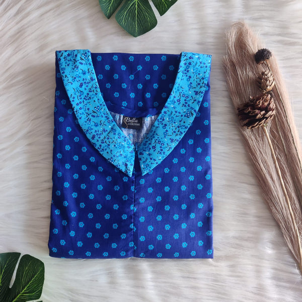 Pale And Dark Blue Printed Premium Cotton Peter Pan Collar Long Zip Feeding Nighty | Free Size | Chest Width 44″| Length 56″