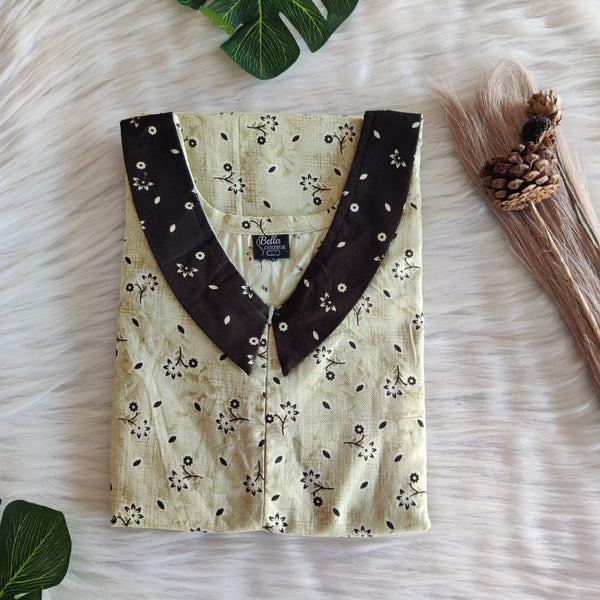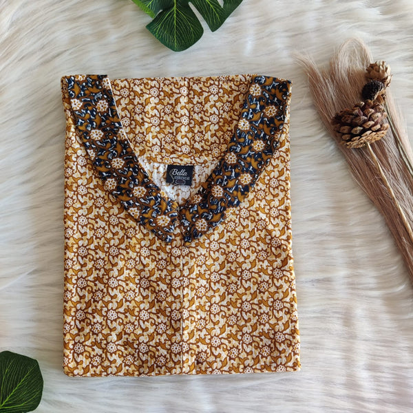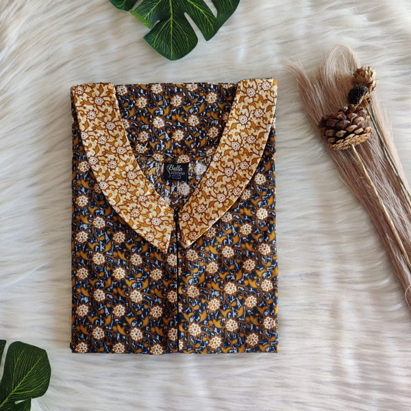 Brown And Orange Printed Premium Cotton Peter Pan Collar Long Zip Feeding Nighty | Free Size | Chest Width 44″| Length 56″