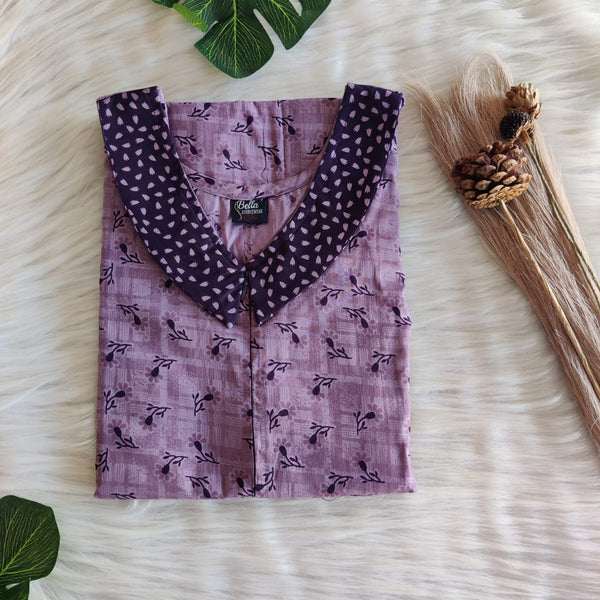 Pale And Dark Purple Printed Premium Cotton Peter Pan Collar Long Zip Feeding Nighty | Free Size | Chest Width 44″| Length 56″