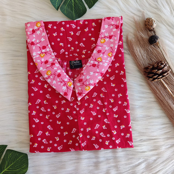 Peach And Red Printed Premium Cotton Peter Pan Collar Long Zip Feeding Nighty | Free Size | Chest Width 44″| Length 56″