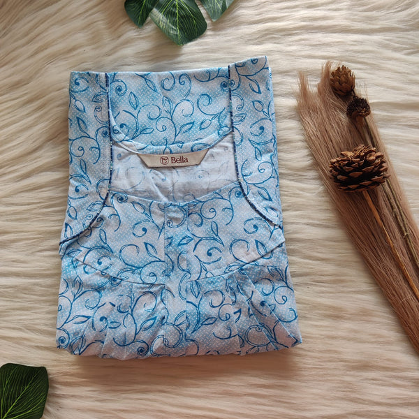Blue Leaf Printed Pure Cotton Plus Size Pleated Zip Nighty | Chest Width 50″| Length 54″-55″