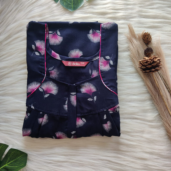 Pink Floral Printed Navy Blue Alfine Plus Size Pleated Zip Nighty | Chest Width 50″| Length 54″-56″