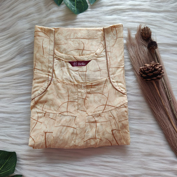 Brown Printed Pure Cotton Pleated Zip Nighty | Free Size | Chest Width 44″| Length 54″-55″
