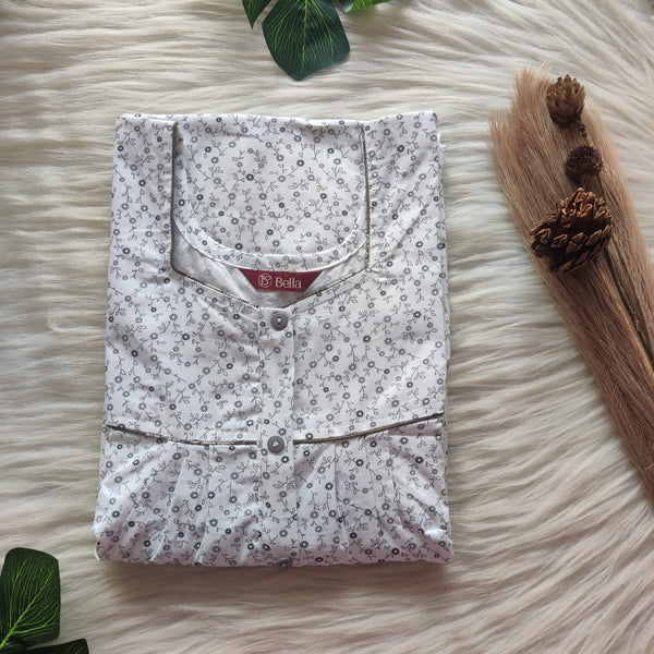 Grey Printed White Pure Cotton Button Zip Nighty | Free Size | Chest Width 44″| Length 55″-56″