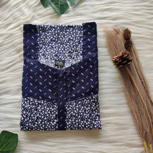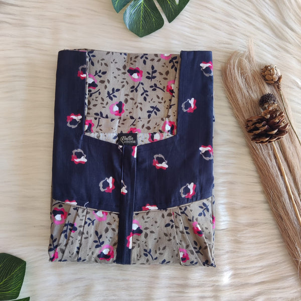 Navy-Blue And Beige Premium Cotton Square Neck Pleated Nighty | Free Size | Chest Width 44″| Length 55″-56″