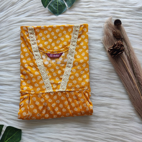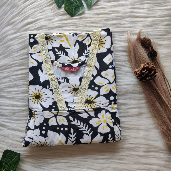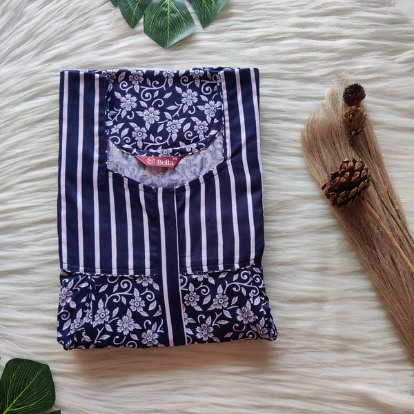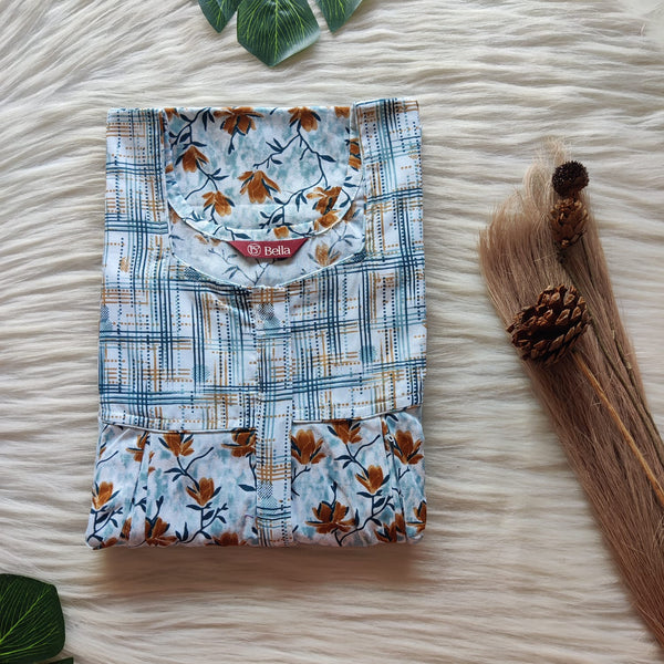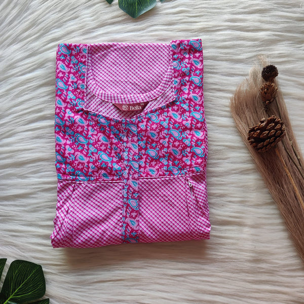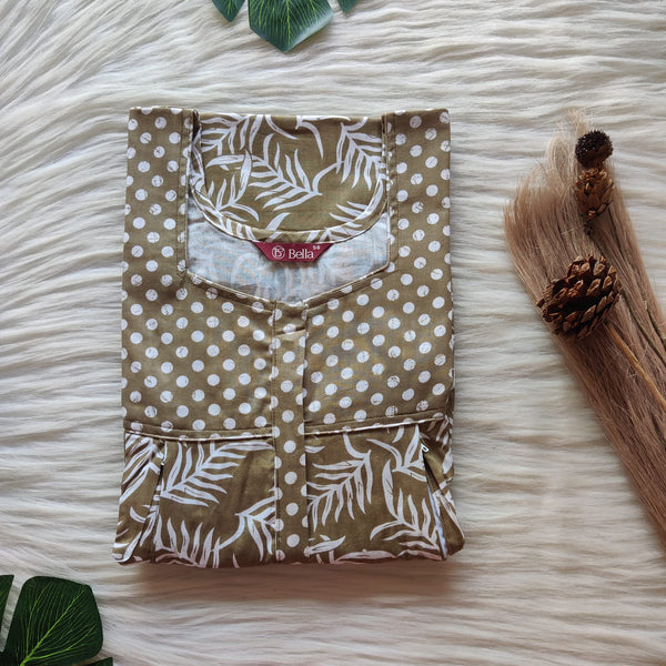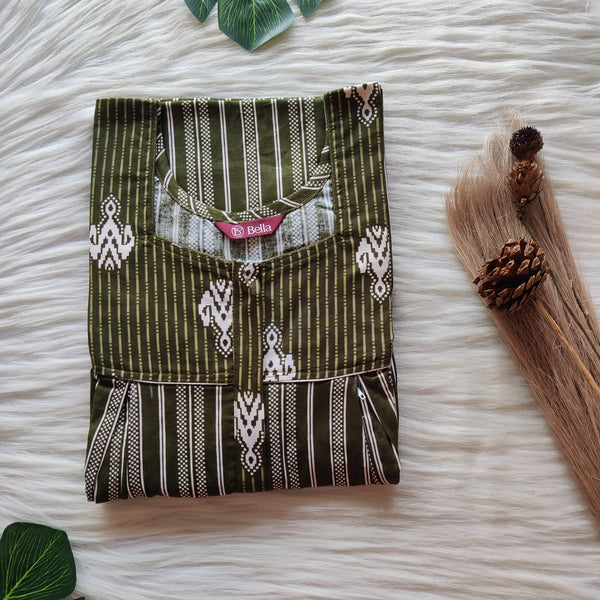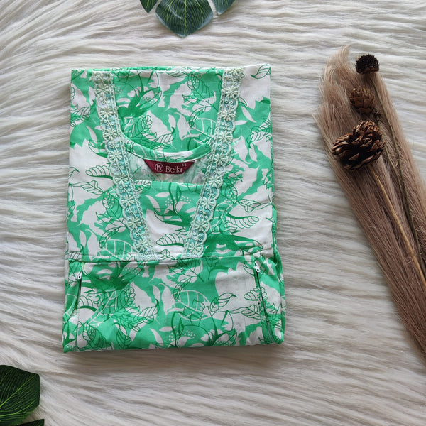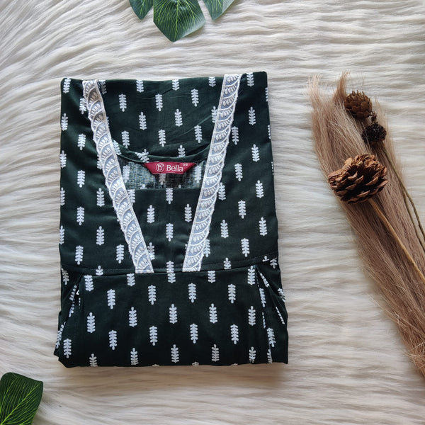Green Printed Premium Cotton Two Side Vertical Lace Zip Feeding Nighty | Free Size | Chest Width 44″| Length 56″