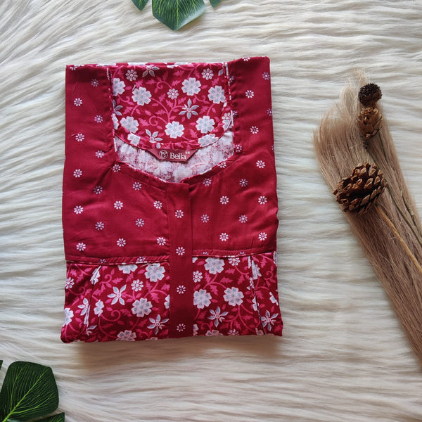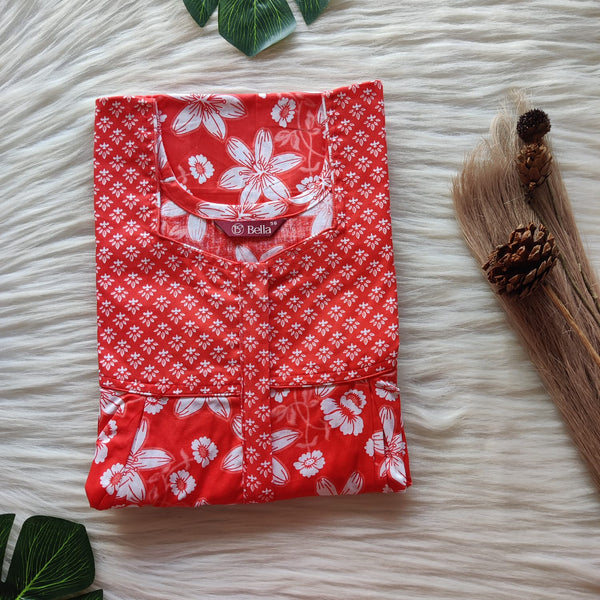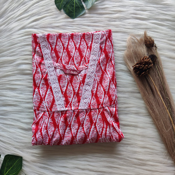Red Printed Premium Cotton Two Side Vertical Lace Zip Feeding Nighty | Free Size | Chest Width 44″| Length 56″